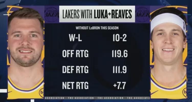 数据显示,本赛季至今当詹姆斯缺席而东契奇+里夫斯同时出战时,湖人表现如下: