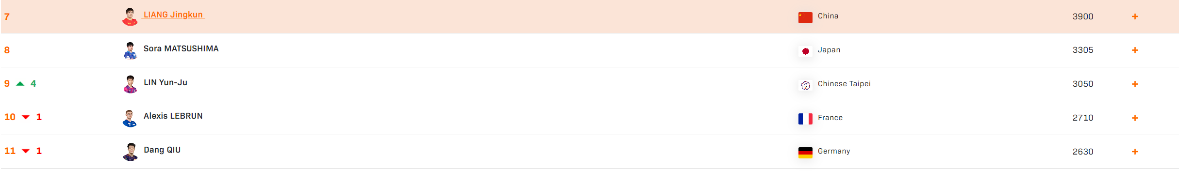 目前梁靖崑的世界排名还在第七,但松岛辉空、林昀儒跟他的差距正在急速减小,这个赛季或许就是梁靖崑跌出前十的赛季了,去年三月开始的腰伤让梁靖崑的运动能力大跌,竞技状态也大跌。