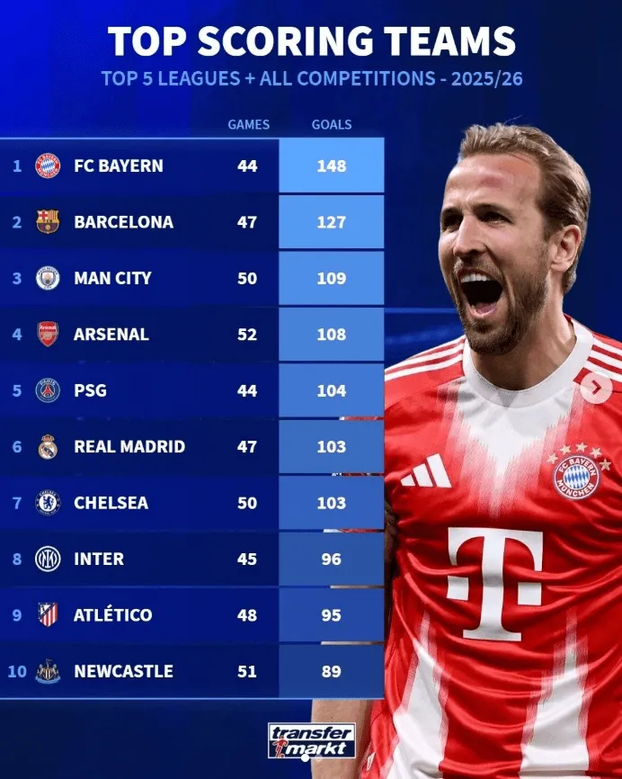 虎扑04月08日讯 德国转会市场统计了本赛季五大联赛在各项赛事取得进球最多的球队,详情如下: